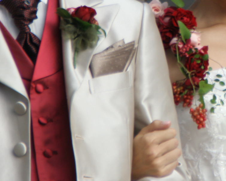 ご新郎様のベストの色にあわせた、深い秋の赤の実ものと、クランベリー色のバラ。