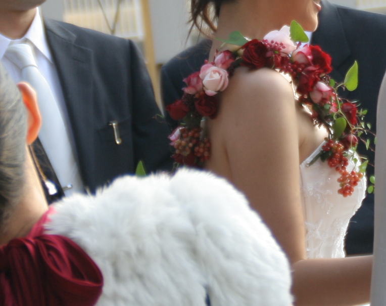 肩に飾る花の飾りと、バックコサージュで一着のドレスをお花直しされました。