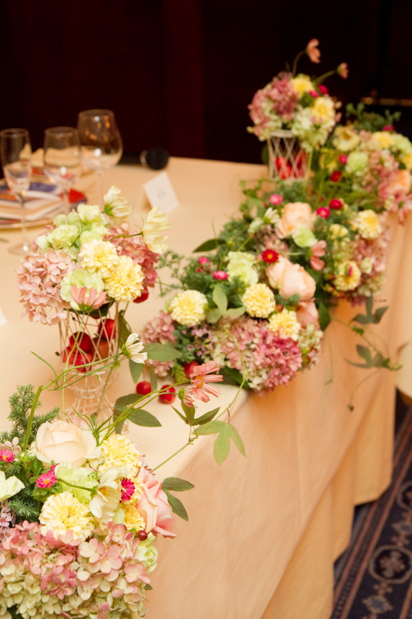 会場メインテーブルのお花と実の飾りがかわいくて、