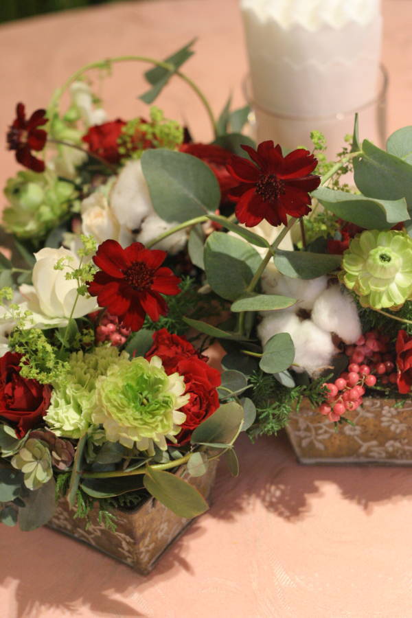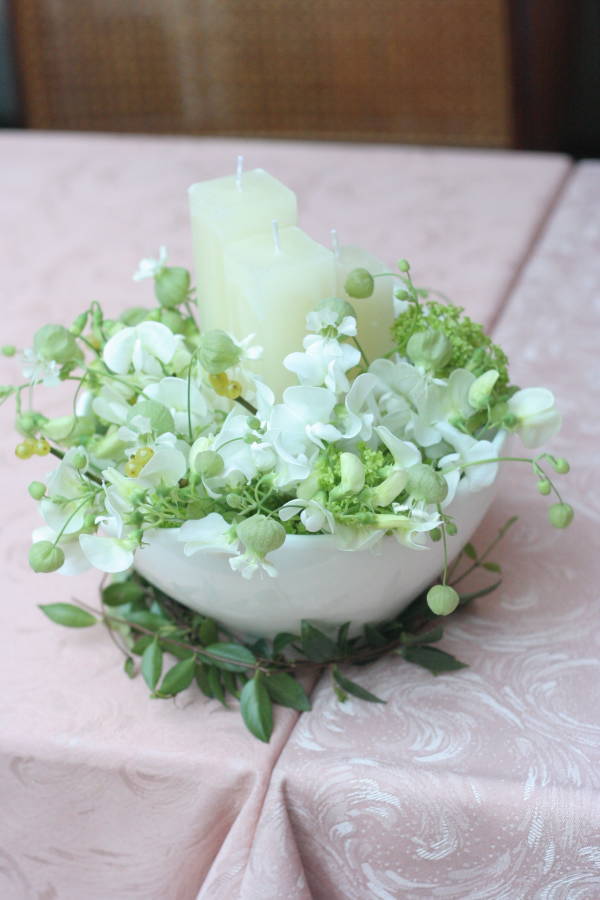 シルバーグレイのユーカリの枝を重ねて、花を飾りました。