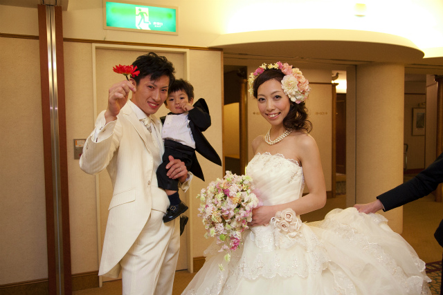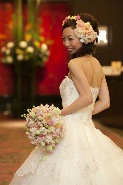 ヘアのお花、ブーケ、ブートニア、会場装花、両親への花束とブートニア、