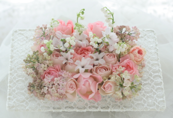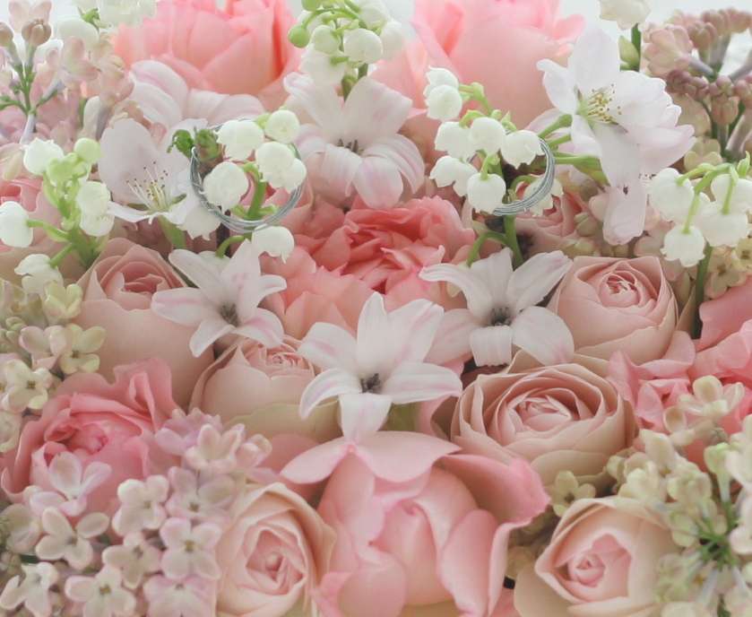 スズランとヒヤシンスと桜の枝で作る、春の花のリングピローです。