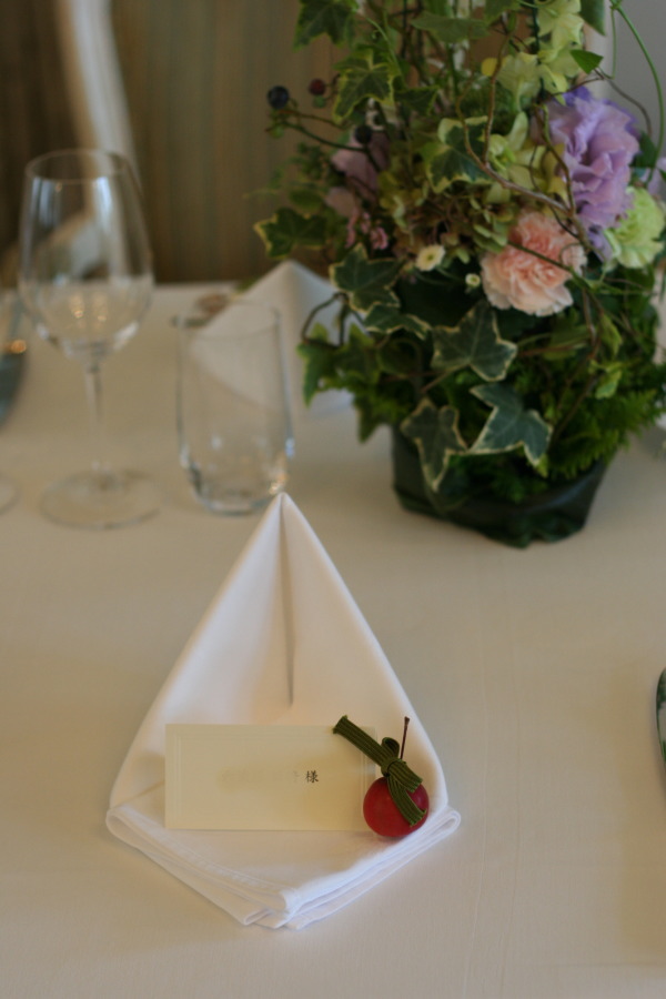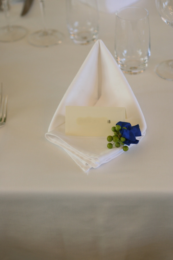 ナフキンフラワーにひとつずつリボンをつけてくれた