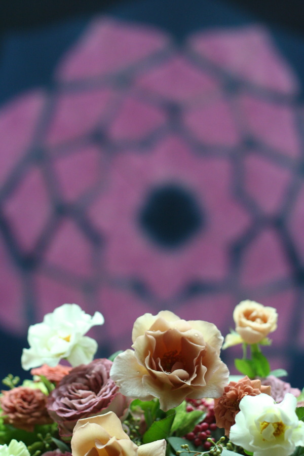 マホガニーヴェール:右側の赤みを帯びた芯のあるバラ(@階段装花) とか