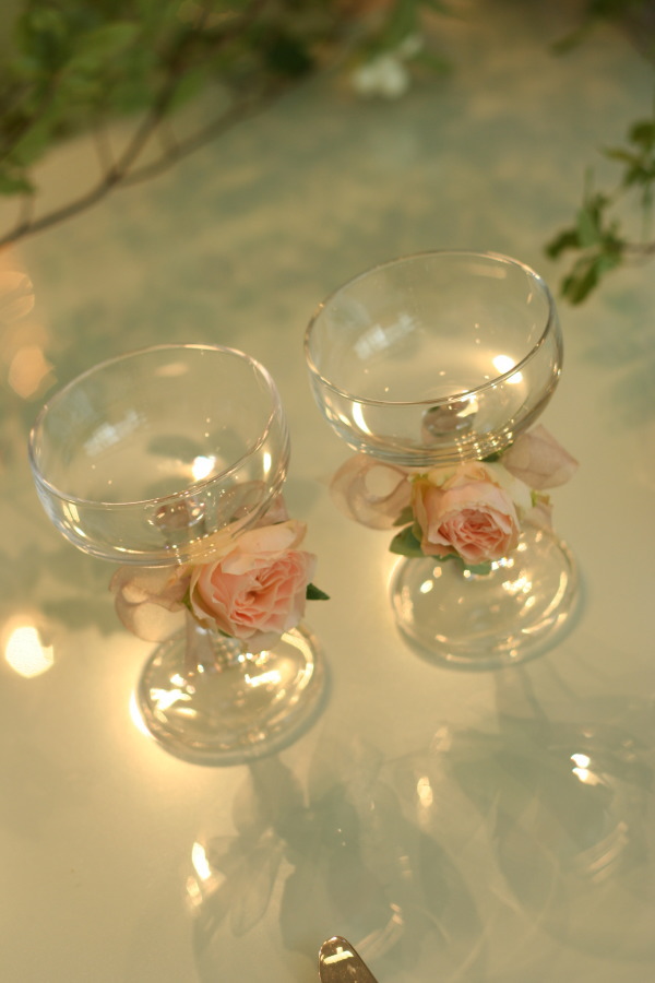 シャンパングラスにつけた小さなベージュピンクのバラは