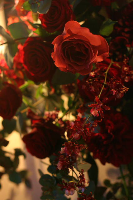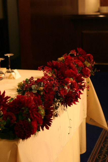 ダリアとラナンキュラスとバラのメインテーブル、