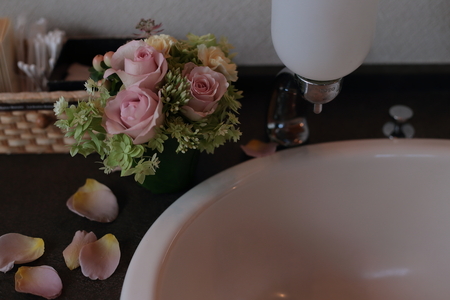 お手洗いの横にも小さな花を。しばらく他の花屋さんが営業にいらしていたとかで久々の納品でしたが変わらない静かな空気を、納品の中、深呼吸させていただきました。