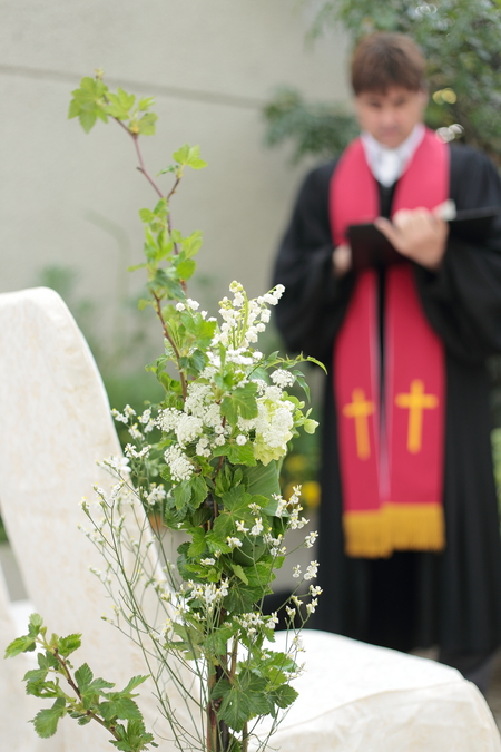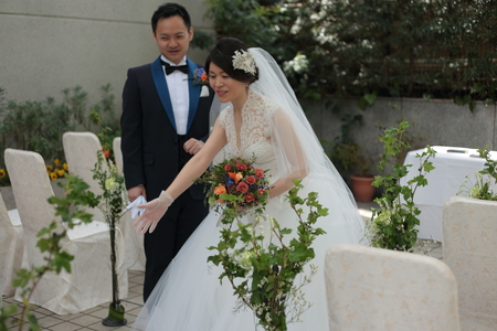 花嫁さんが、挙式装花のチェアフラワーをさして、