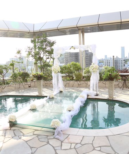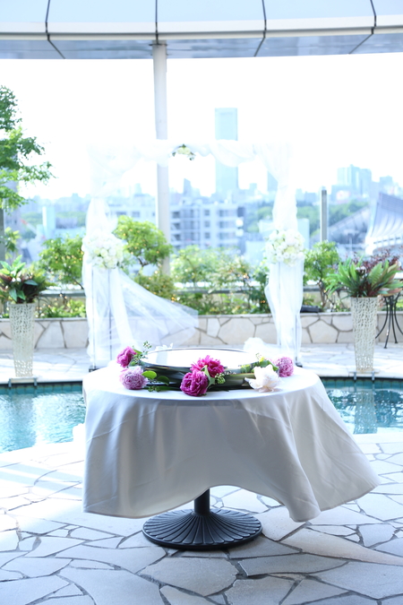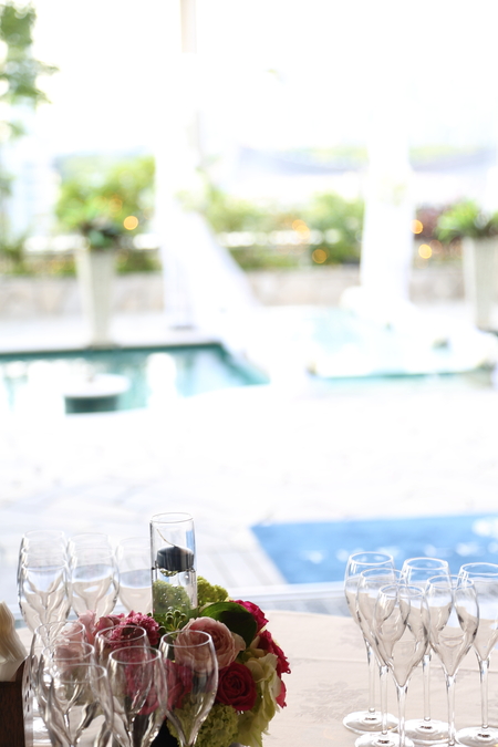 プールサイドの初夏、ケーキの花ごしに見えるのは