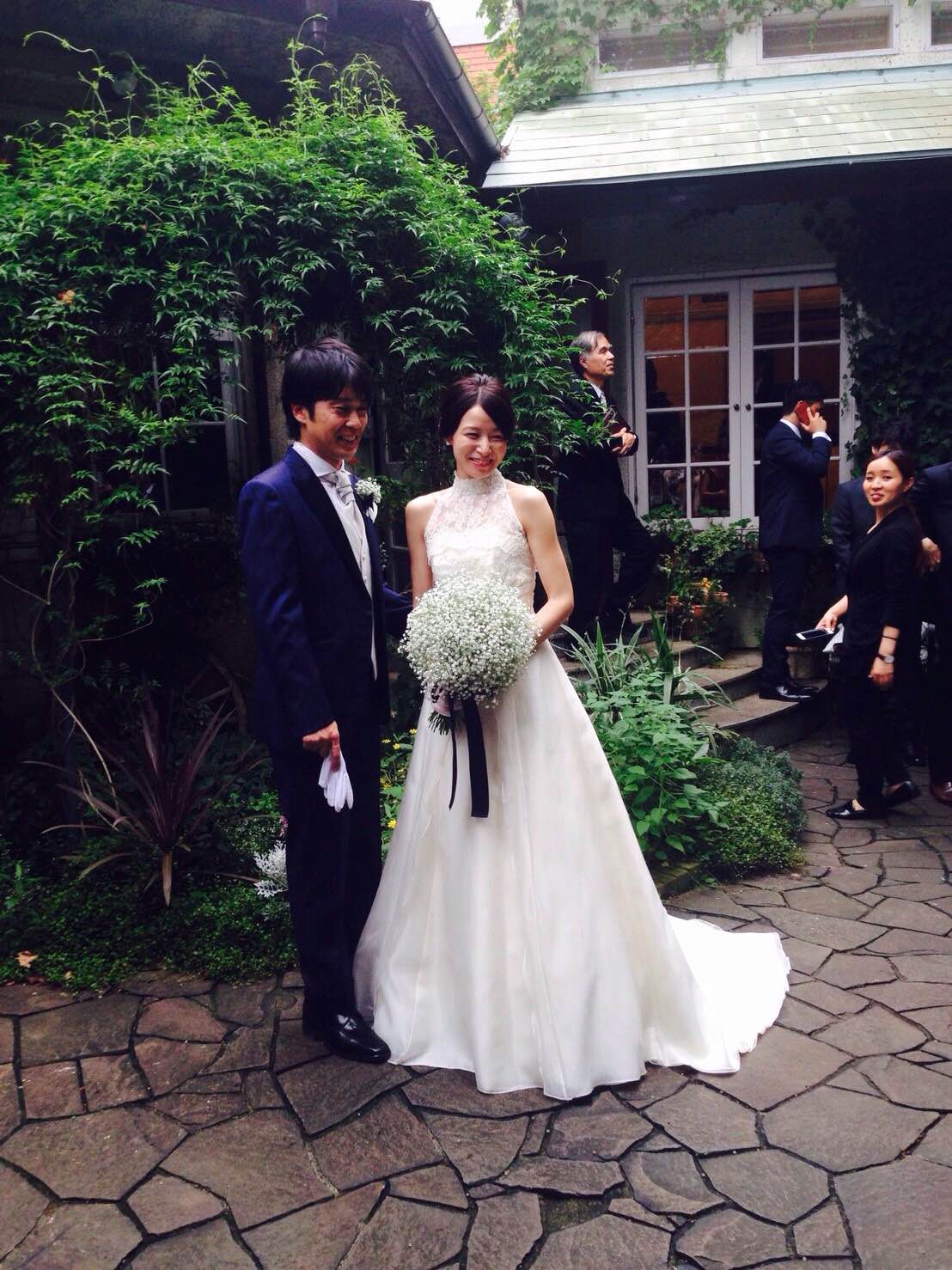 披露宴後すぐに花に囲まれた写真が送られてきました。