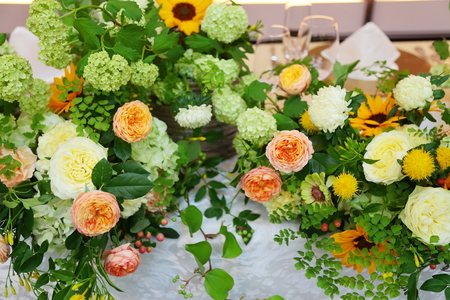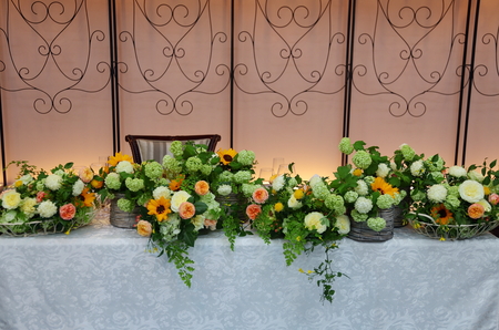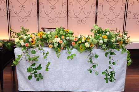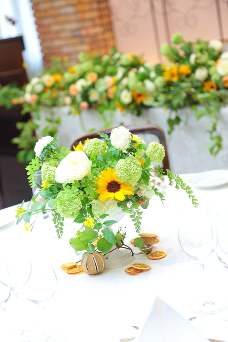 初夏の装花です。初入荷のひまわりをアクセントに、