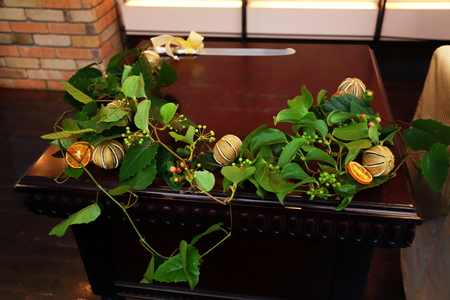 ケーキ装花は、ブドウっぽいつると、サンキライと、