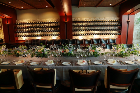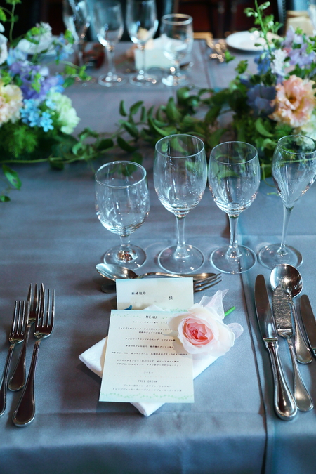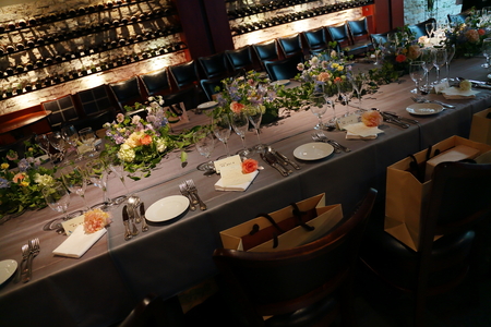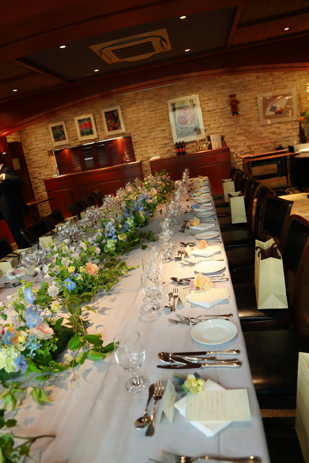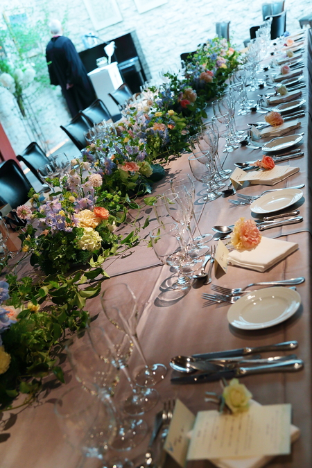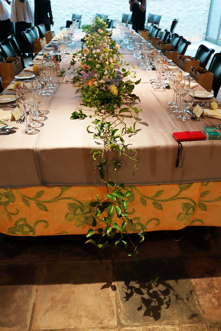 卓上装花をつないだつるが、テーブルクロスの柄とあっていて、