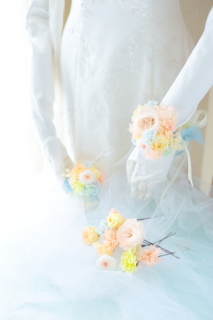 手首に飾る花のリストレットとブートニアとヘッドドレス、