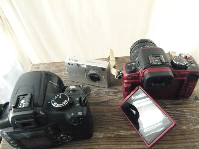 右の赤いのが新しく買ったパナソニックのLUMIXのG1。