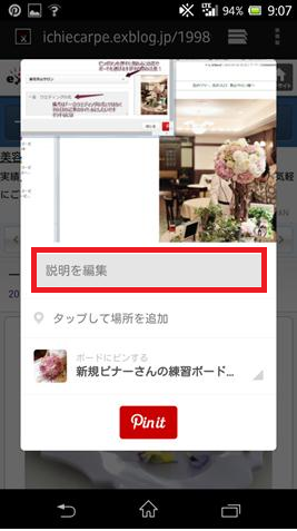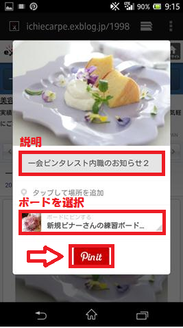 6) 説明に一会ブログのタイトルを記入、貼りたいボードを選択して、「Pin it」を押す