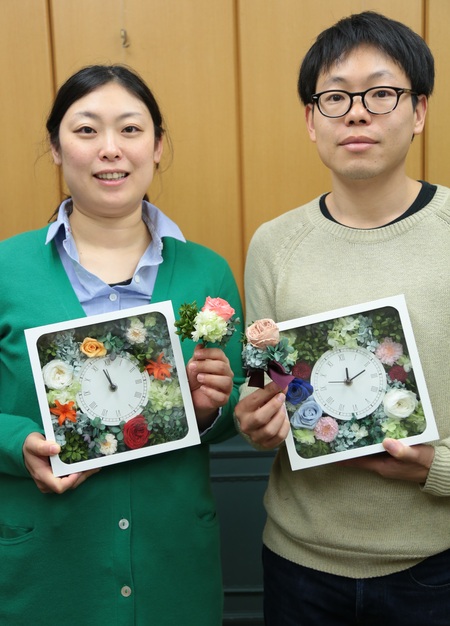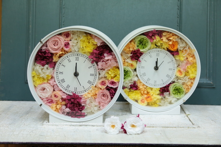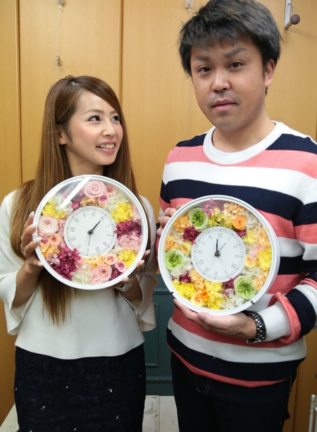 こちらのお二人は花時計とお父様コサージュ、ナイフ装花とウェルカムボードのお花を作成。