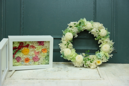 フォトフレームとリースを作ったのは、定期レッスンの生徒さん。