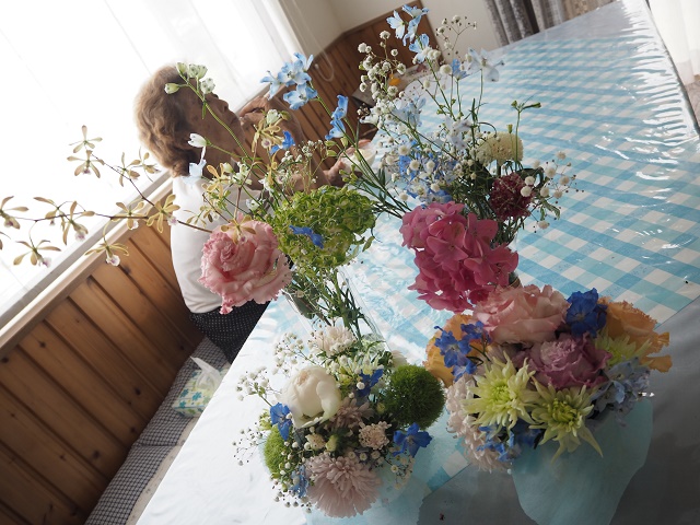 私がアレンジメントを始めると、花瓶に生け始めました。